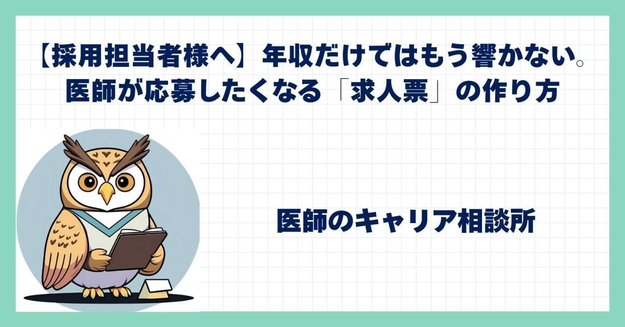 こんにちは!医師のキャリア相談所のbatao(ばたお)です。 医療機関の採用担当者様の中には、 「相場より高い年収を提示しているのに、なぜか応募が集まらない…」 「他の求人に埋もれてしまい、自院の魅力が伝わっていない気がする…」 このような...